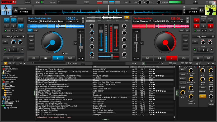 En su instalación inicial se muestra como dos platinas asociadas a una mesa de mezclas central y, sobre estas, están las gráficas de las canciones, quedando en la parte inferior el gestor de listas de reproducción. Incluye numerosos controles de PITCH, ecualización (altos, medios, graves), efectos de audio y vídeo, samplers, loops, calculo de BPMs y tiempos de reproducción, búsquedas automatizadas,… Y desde su versión 8 también es posible agregar botones personalizados y es fácilmente configurable para trabajar con 2, 4 o 6 platinas.